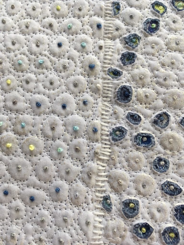 Layers of recycled business shirts, worn out family clothing, dyed tea towels, woollen blanket, sari silk, polyester machine threads and embroidery threads. Print. All layers are machine stitched together; sections are cut away to reveal underlayers. Colonial knots and hand stitch