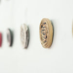 This piece uses plastic packaging disks of cheap sewing pins. The pins are terrible, but the disks make great resists. This piece is about 70cm wide, I only had 4 disks, more would create more distinct circles.Concertina folds with a resist of cassette tape winders.